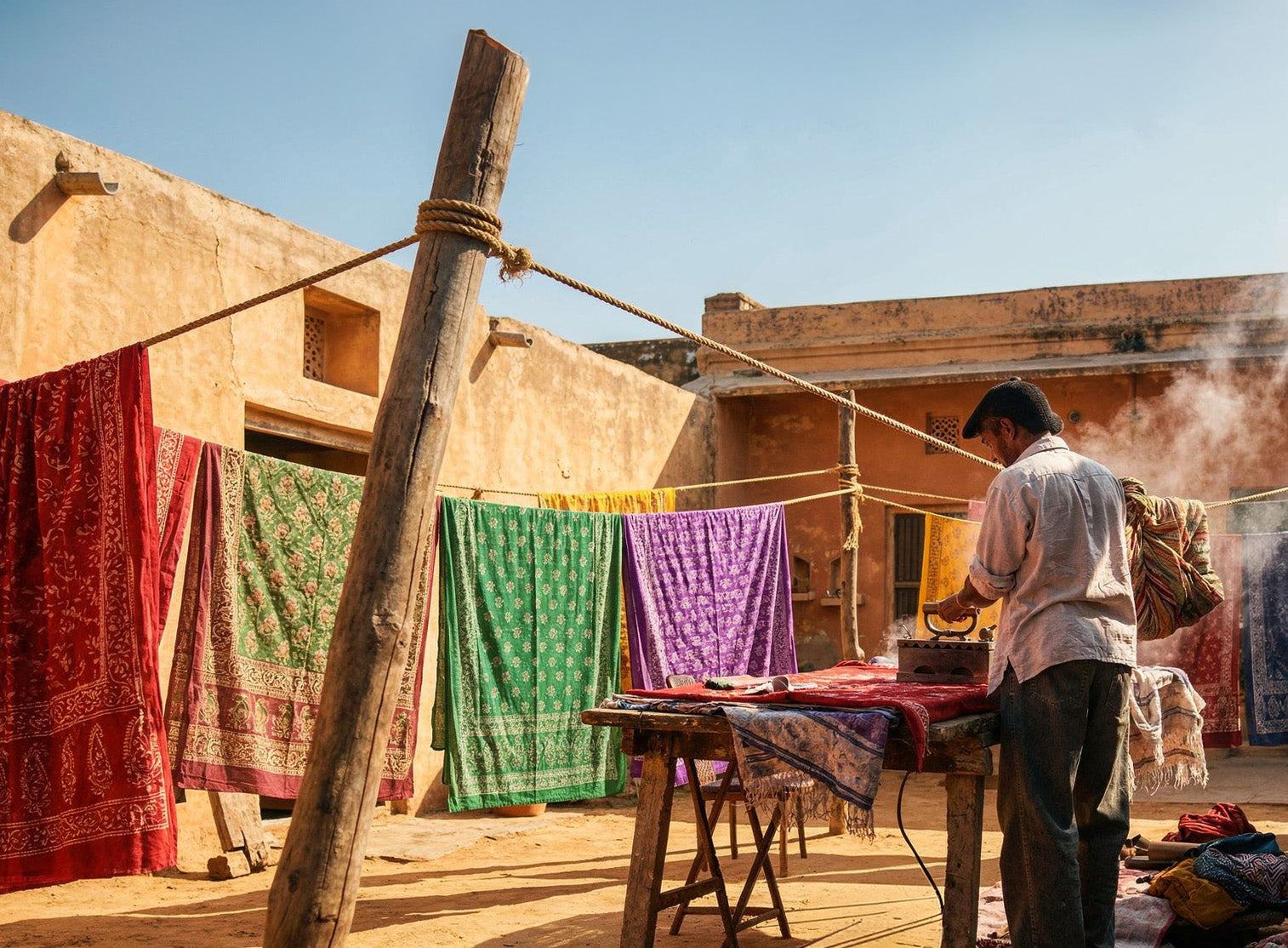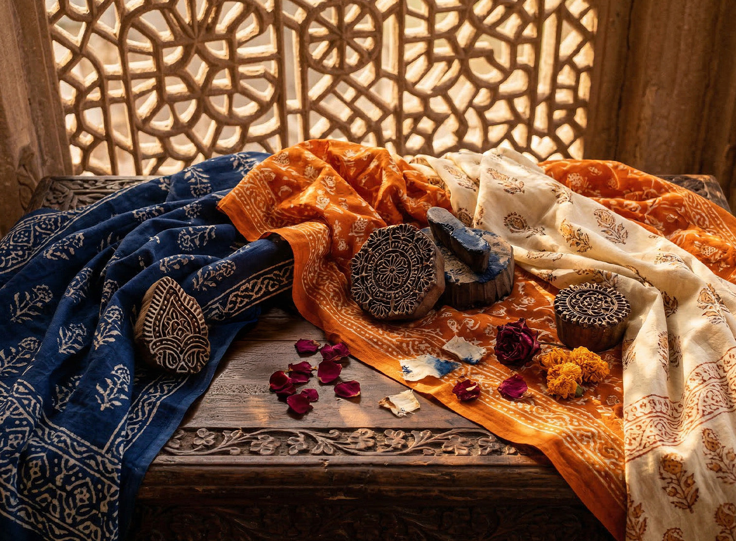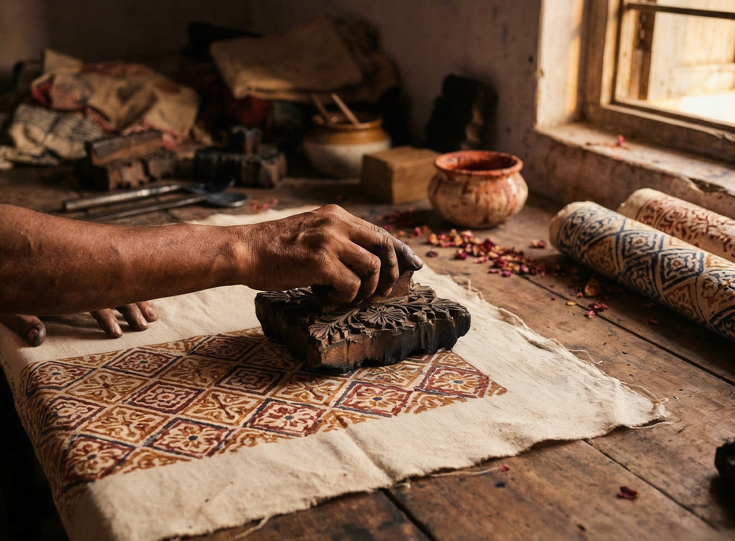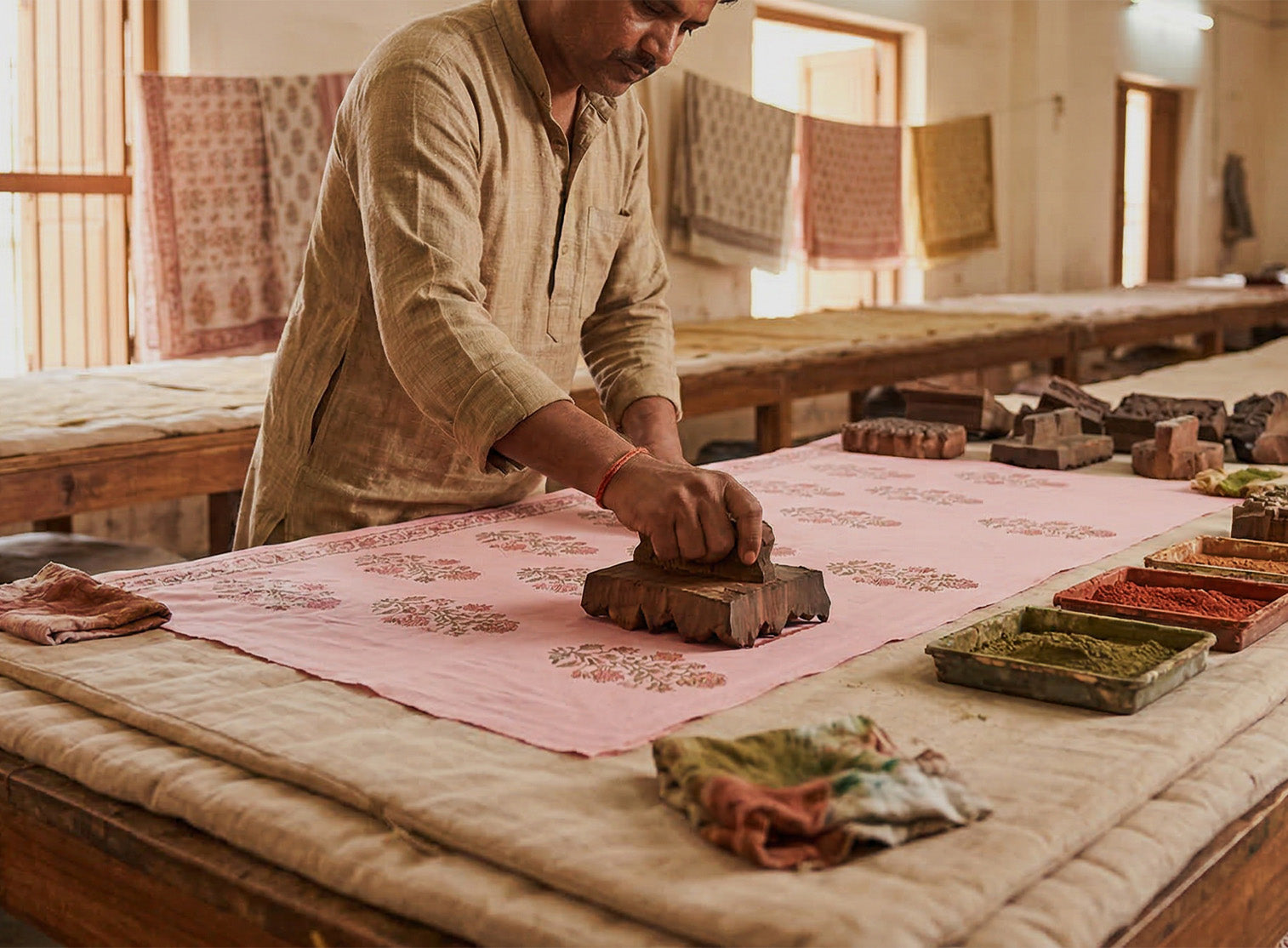 Traditionally, printing was done on low wooden tables known as patias. Today, larger and elevated tables are used to enhance efficiency while maintaining the integrity of the craft.
