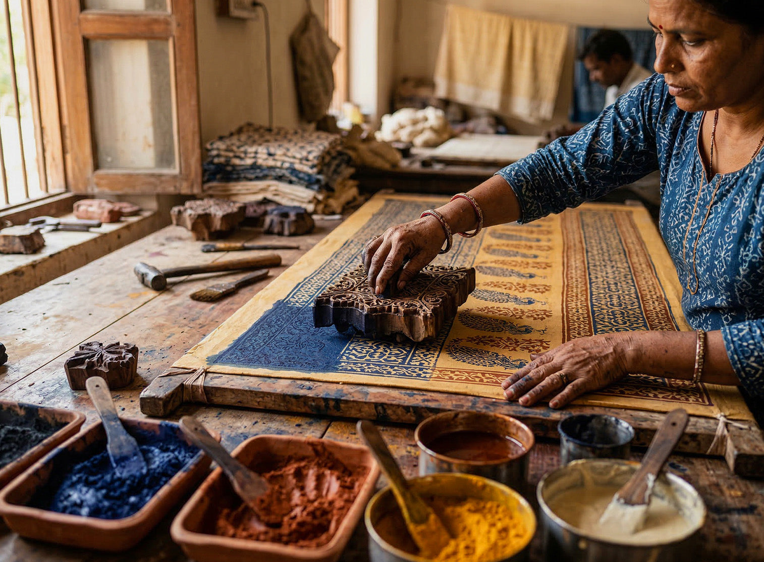 For multi-colour designs, additional artisans follow—each applying a different block and colour layer with perfect alignment. This requires exceptional skill, as each layer must seamlessly integrate into the overall design.
