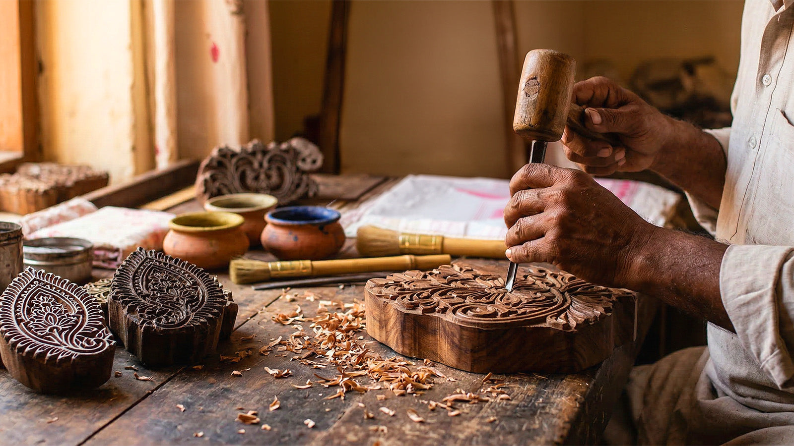 The choice of wood is crucial. Sheesham (Indian teak) is preferred for its strength and durability, especially for outline blocks that undergo maximum wear. Softer woods like Roahda and Gurjan are used for filling and background blocks, as well as for specialized techniques such as Daboo printing.