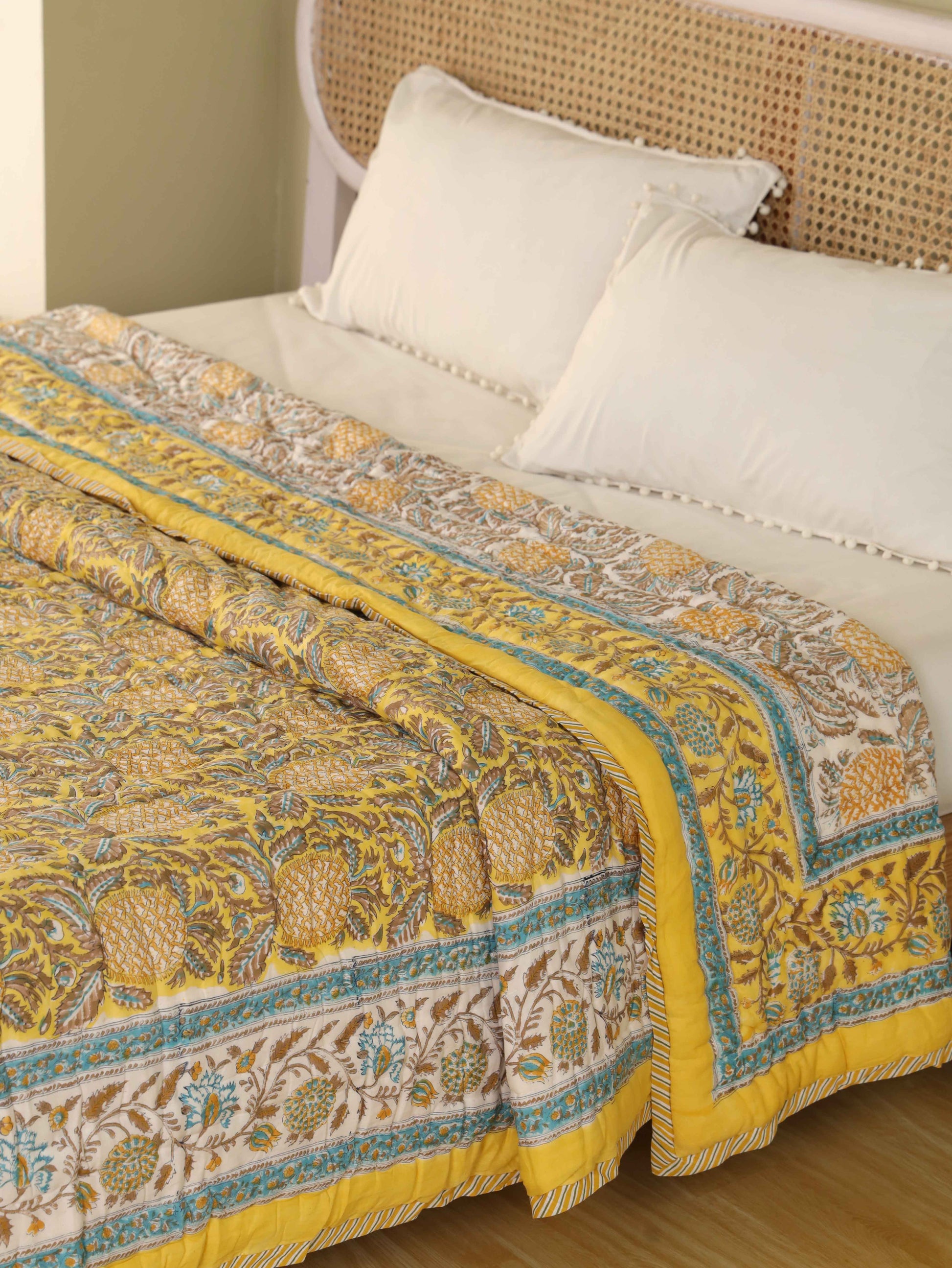 - Quilt : The Quilt takes center stage with the captivating , meticulously handblock printed to create a visually captivating effect. Made from premium cotton fabric, the cover offers both opulence and comfort, transforming your bed into a sanctuary of style