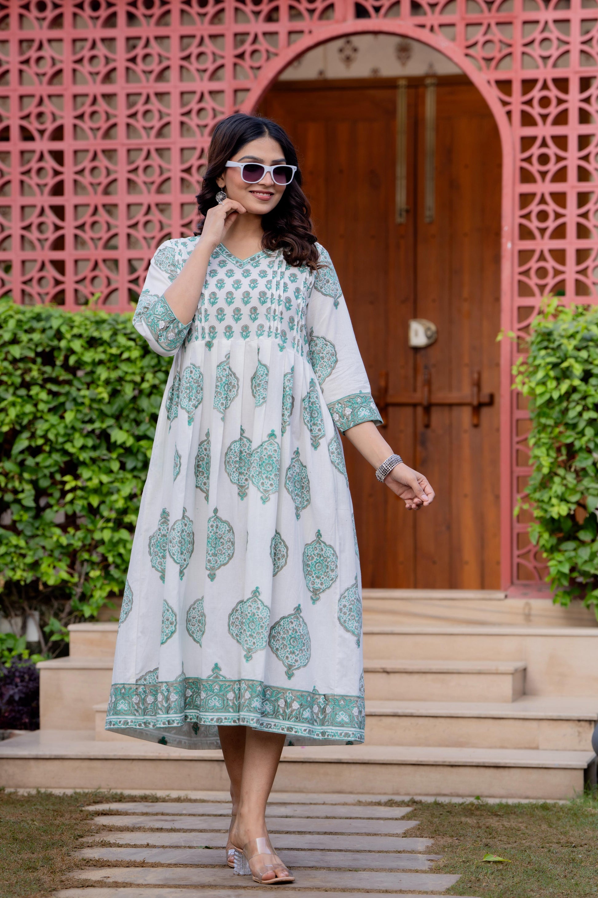 Since the dress is created using traditional hand block printing, slight variations in print placement or colour tones are expected. These natural irregularities celebrate the handcrafted character of the garment and make each piece uniquely beautiful.