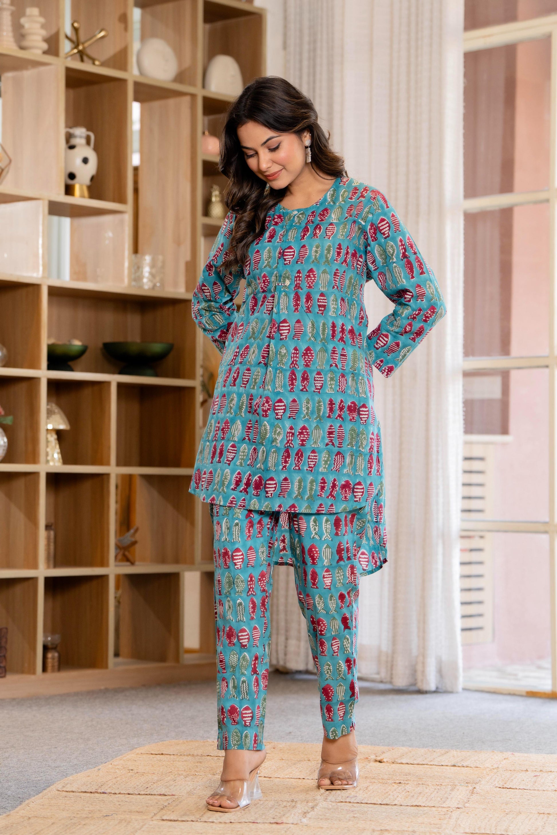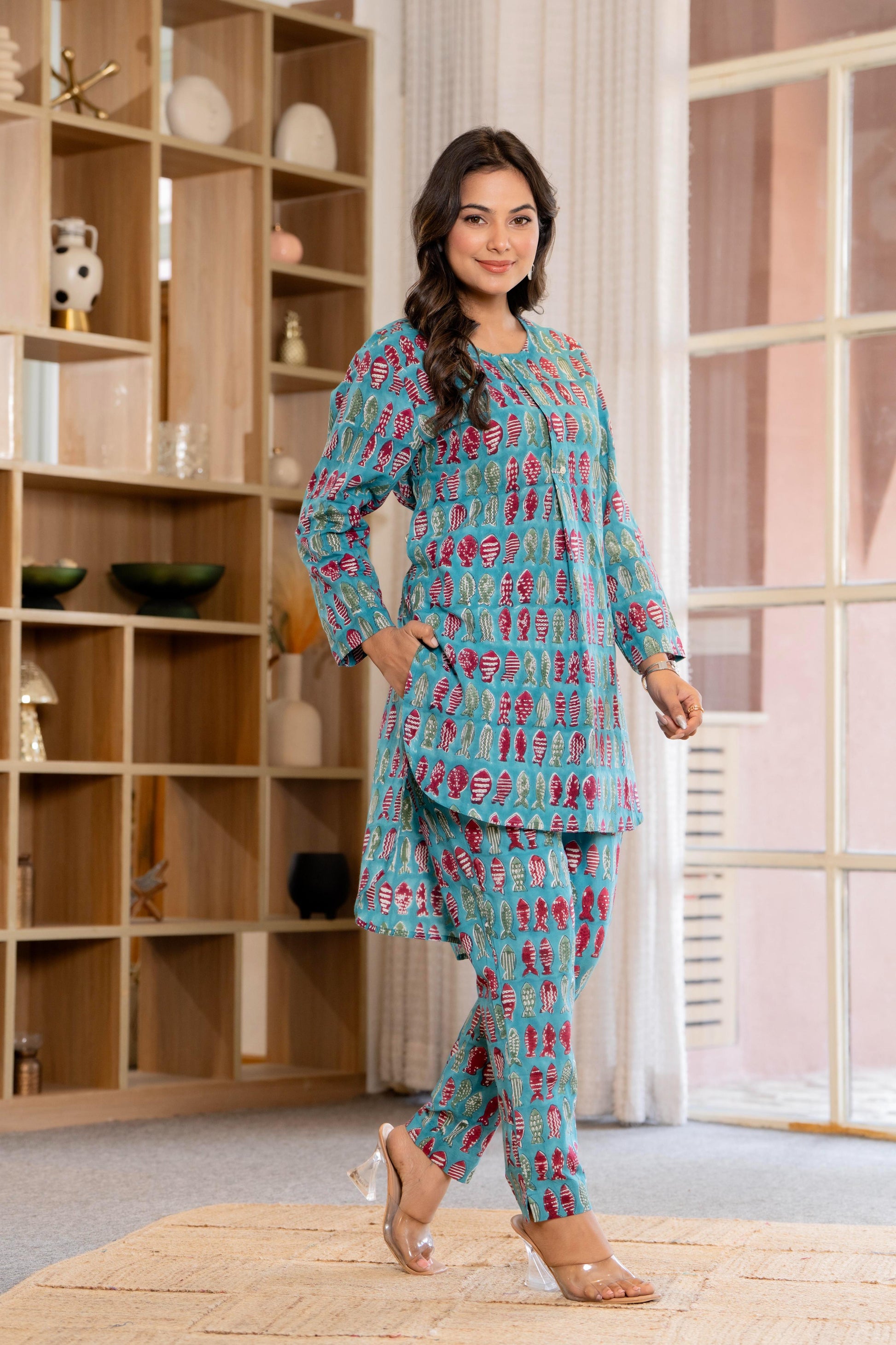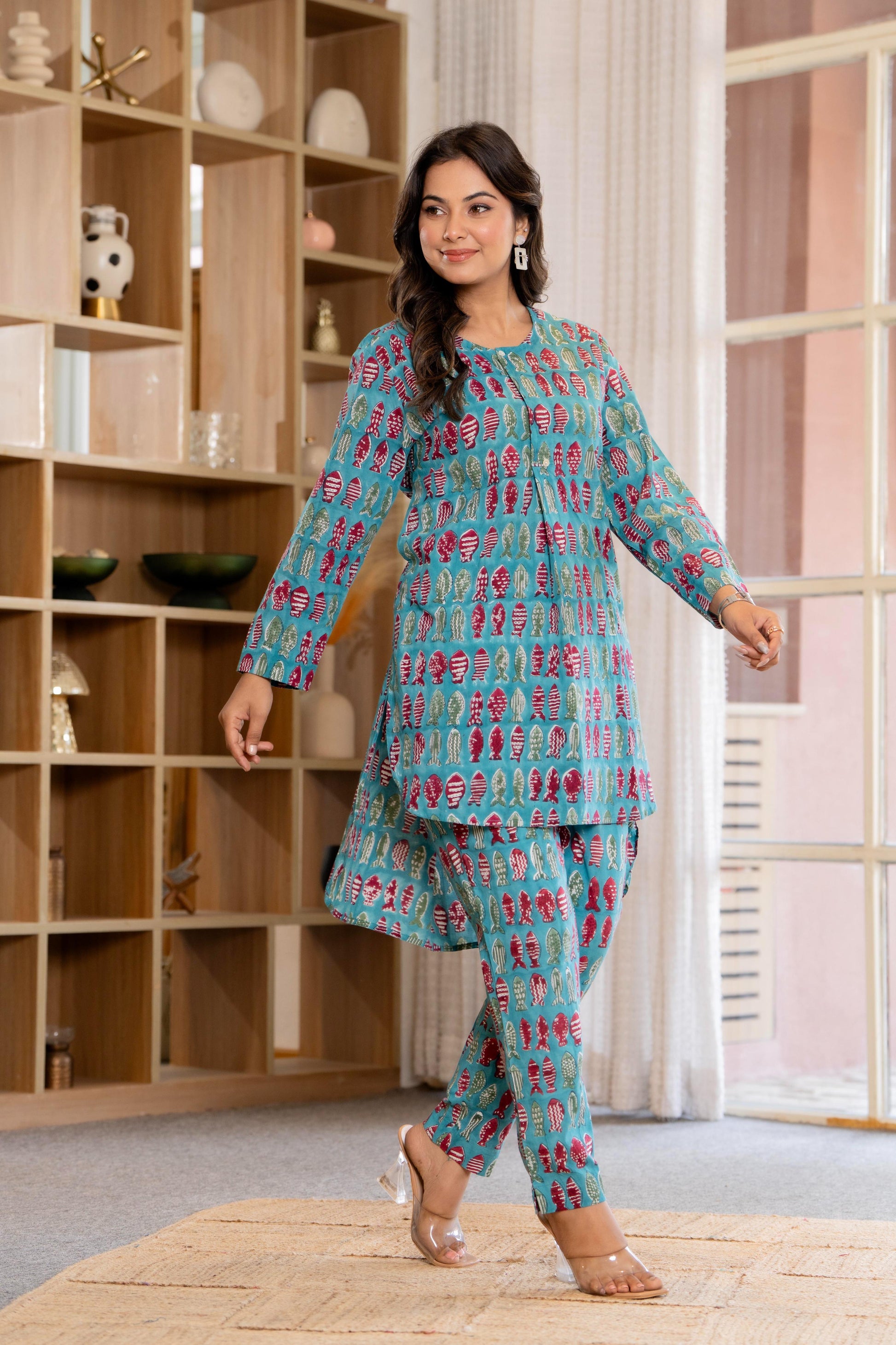 This Hand Block Printed Cotton Co-Ord Set features a perfectly matched top and bottom crafted in soft, breathable cotton. Hand-printed by skilled artisans, each piece reflects timeless Indian craftsmanship with modern ease. Designed for comfort, versatility, and everyday luxury.